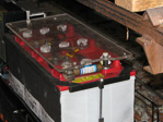 Scott Hewis had the cover off his engine and was charging the system so I took the opportunity to take a picture of the inner workings. Scott has his battery charger mounted right onto the unit which is a 36 volt charger for the 6-6 volt batteries he carries. |