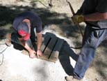 George trying to stand on his head to clean out the pipes and bottom of the "manhole". Ken built the frame that went around the pipe to support the cover boards and they are going to check it's height from a grade stake. |
