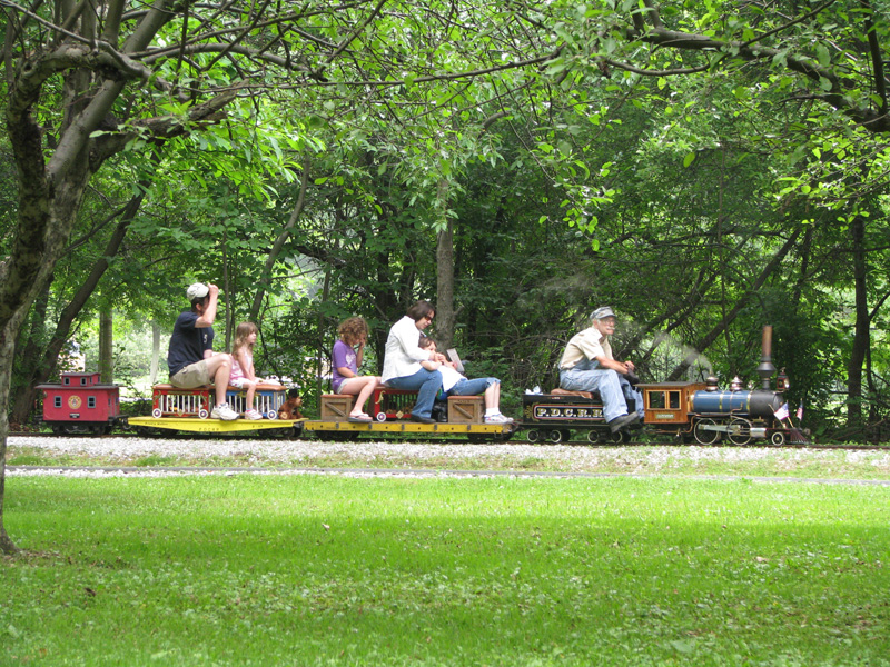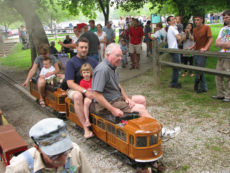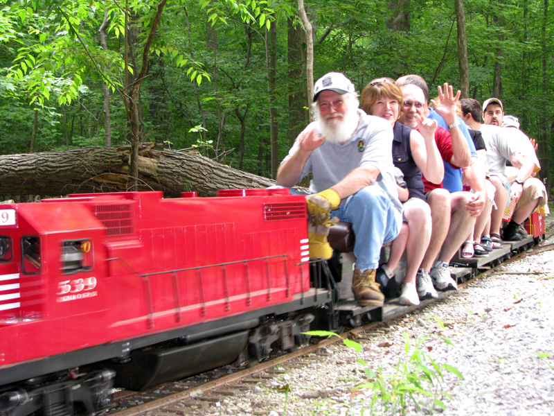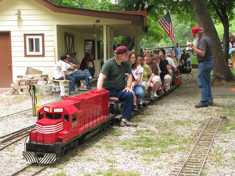 John as engineer waits for Roy to finish rider instructions before he moves his train. Frank with a trainload of passengers cracks the throttle as East Wind moves out with the chuffing sound of a engine hardly working. |