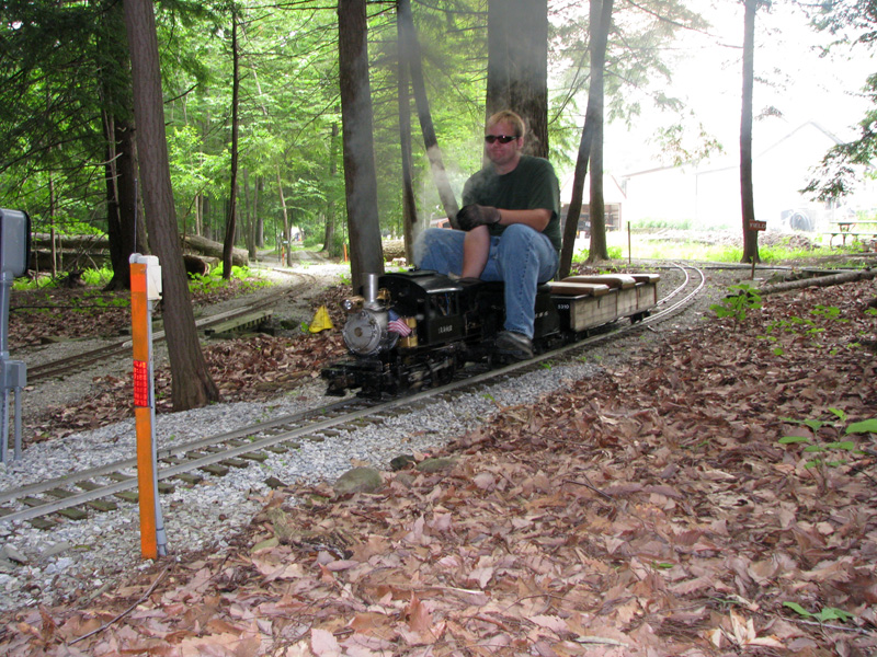 Behind the station on the Orchard Loop Josh Frank as engineer is taking some guests for a ride with Georges' gas powered military switcher. Chet's thinking the fires O.K. and the water gauge level is O.K., just need to hear "All Aboard!" from Roy to start this run. |