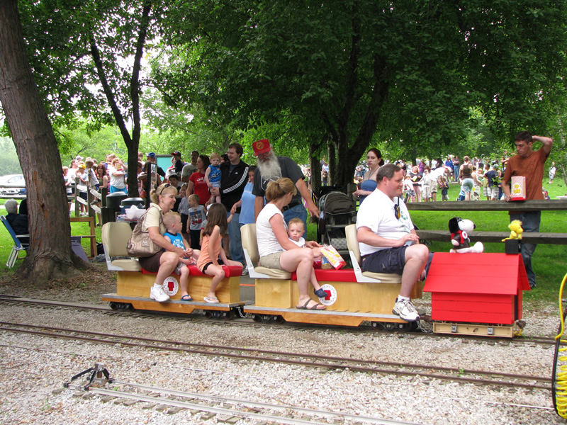 Mike coasts to a stop as Dicks' trainload of passengers with Scott Hewis as conductor leave the station. Snoopy with Woodstock on the roof of the engine depart with another load of passengers. |