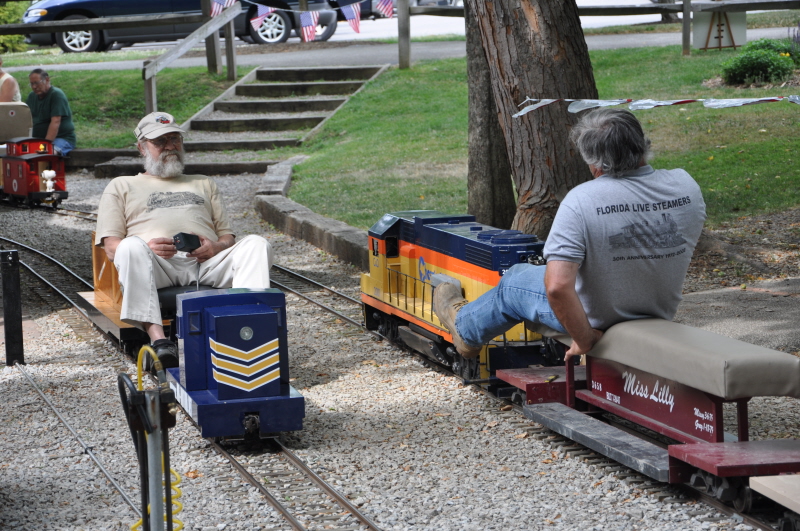 Claire running Scrappy on the Orchard Loop behind the station as her dad Jeff Foster points out something to her. Sit at the station and they will all come to you as John with his GP 40 arrives back at the station with his passengers. |