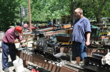 Brendan Ruger passes through the station eastbound with Chris's homemade electric powered boxcab with Chris riding behind him. John Riba at the controls of his GP40 will soon be arriving at the station with his load of passengers. |