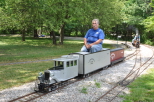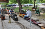 Brad Studd with his gas powered Northfolk Southern switcher andwell that there train sitting in front of the station eastbound with his load of passengers. A view of Brad and his train as he departs the station eastbound with his passengers. |
