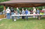 The attendees lined up to await being served their steak dinner as they pass the food serving table and that's the raffle prizes being displayed on the tables in the foreground. A view from under the shelter as the attendees load up their plates with food. |