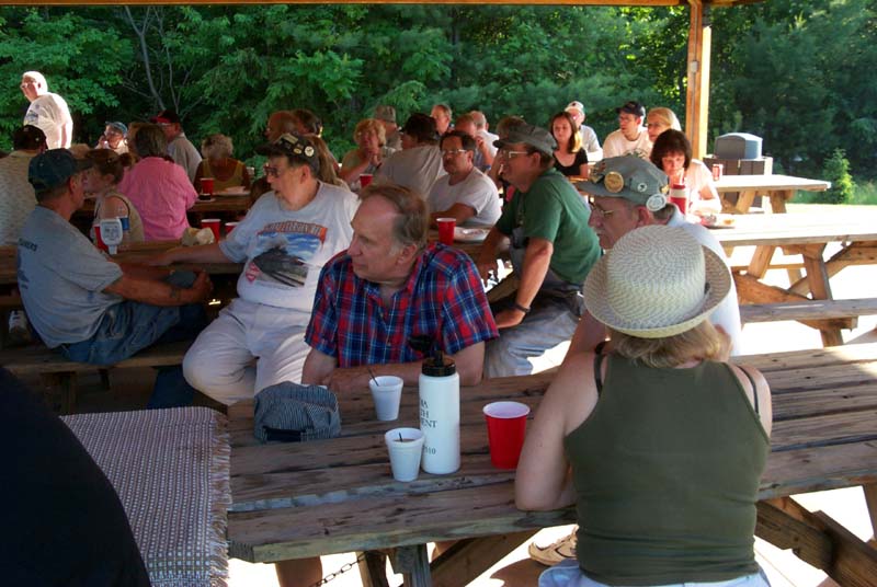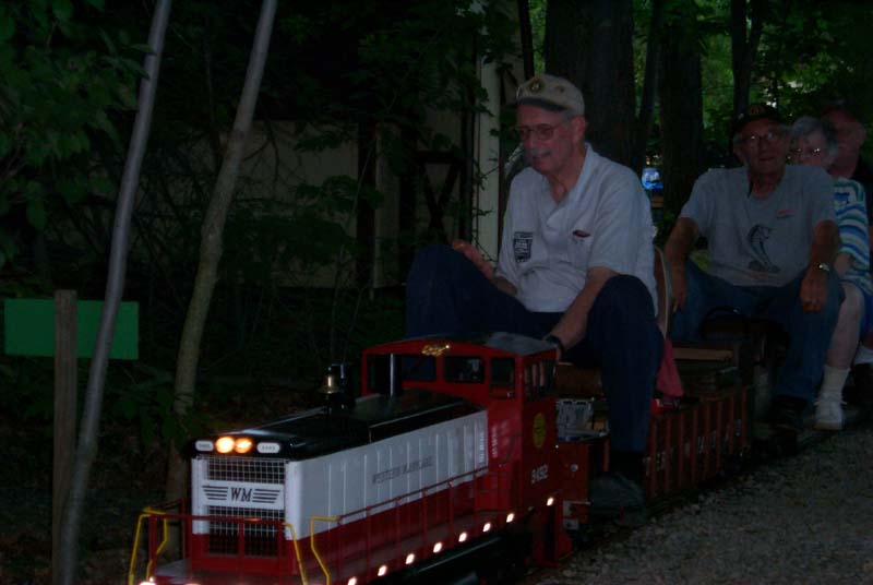 The group waiting for the winning number of the last few raffle prizes to be called out. Karl bringing the Hudson back to life as Bill Hayes from Michigan and Rex Shriver discuss Rexs' train. |