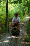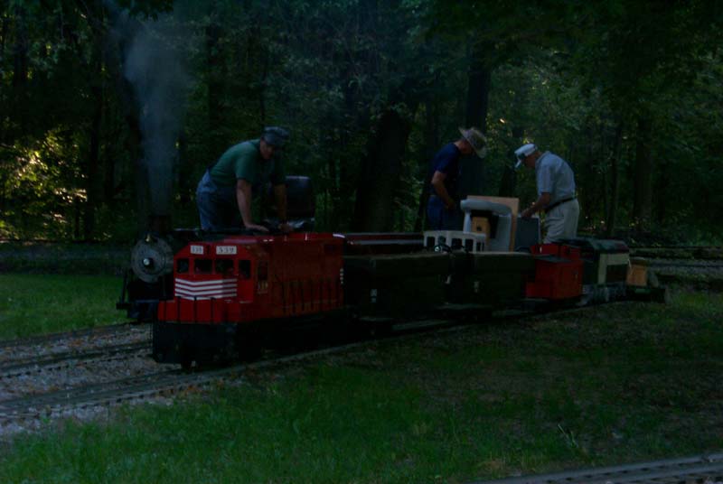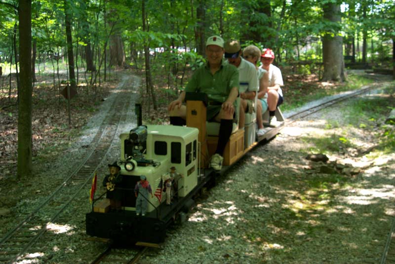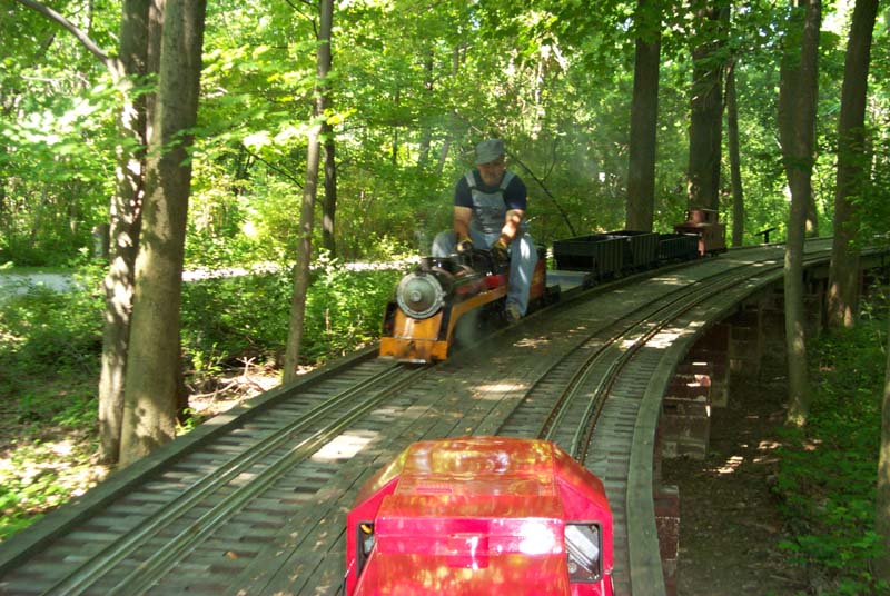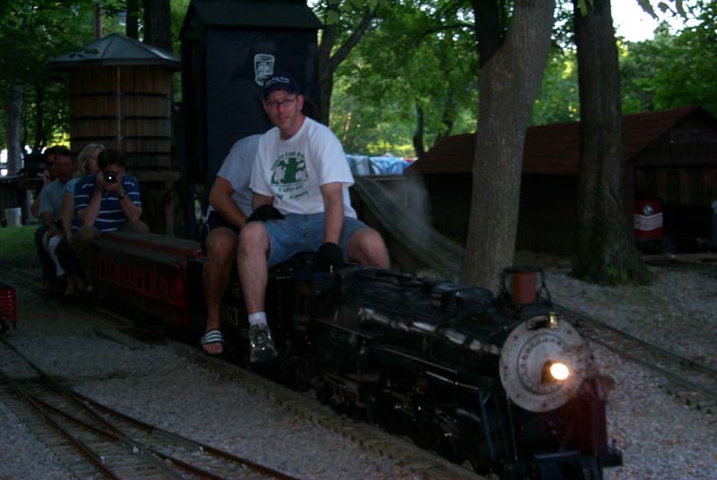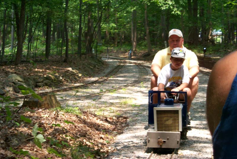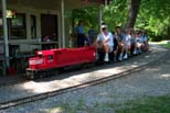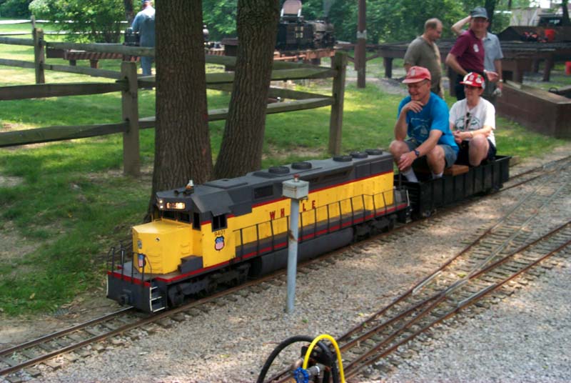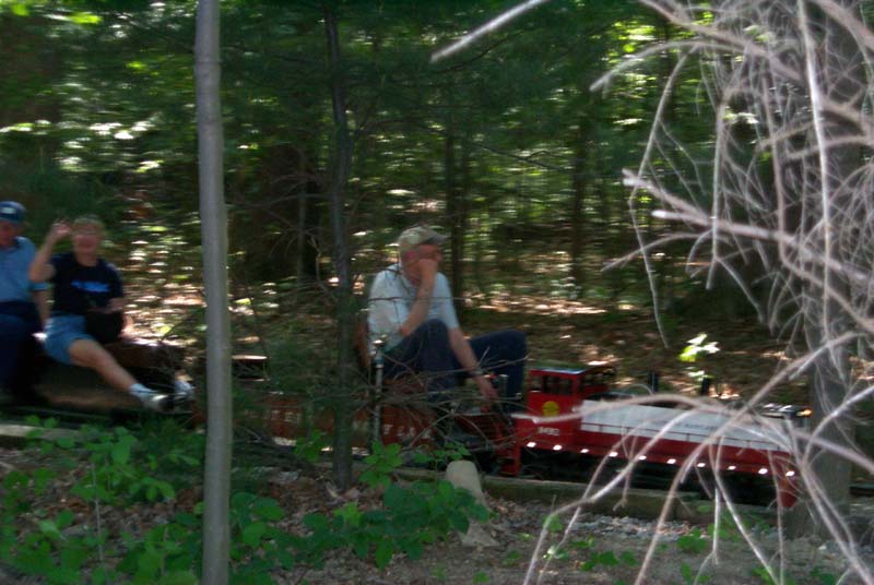 Don Spiedel and Dave Schweitzer doubleheading their train load of passengers. Dave Foster taking his family for a ride through the woods behind the GP38. |