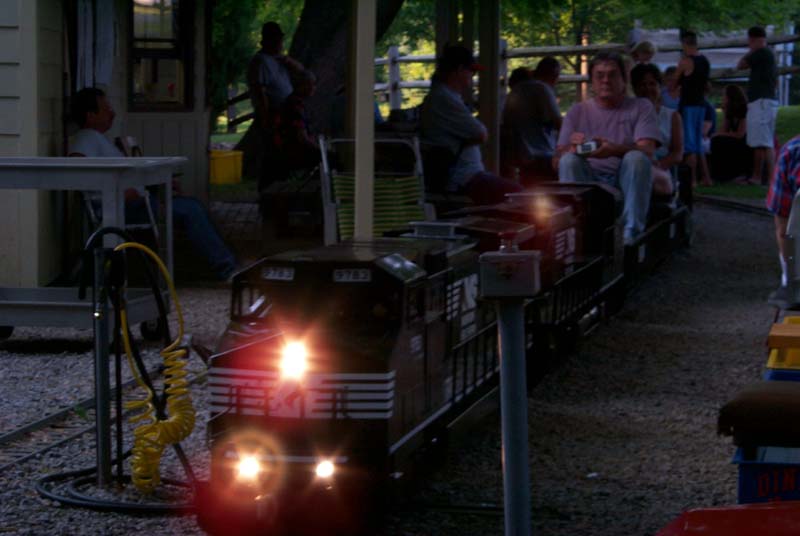 Neal Smith with headlight and ditch lights on, passing through the station. Out from under the trees its lighter as you can see Neals' train ahead but darkness is settling in. |