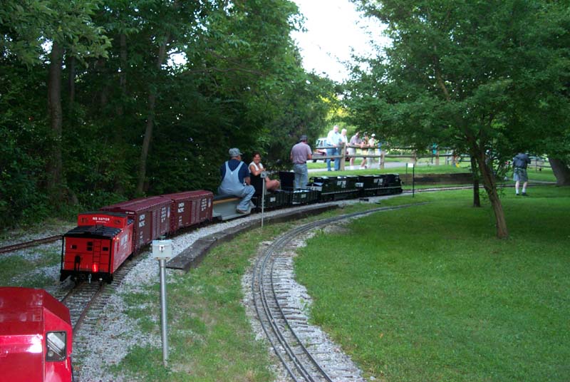 Dick Philpott who made up the electronic controller for George Woodlings little trolley gets reacquainted as he takes it for a ride. Neal Smith rounding the curve at the station with his double-headed Dash 9's. |
