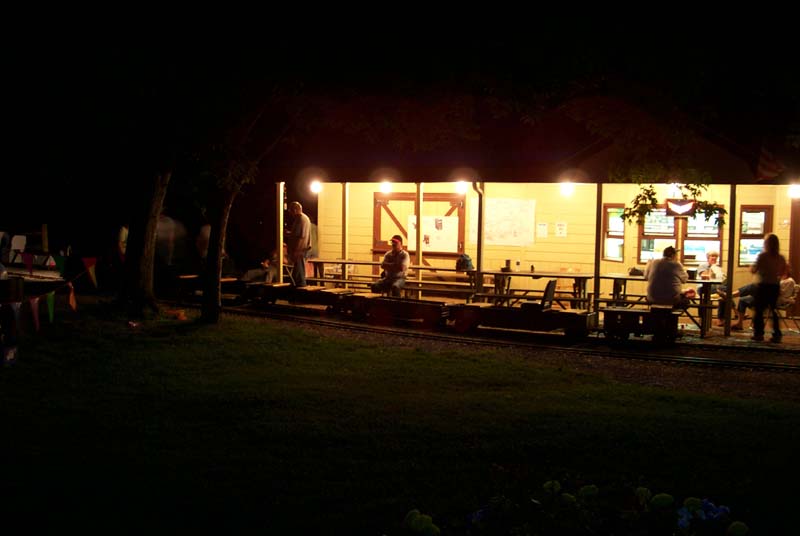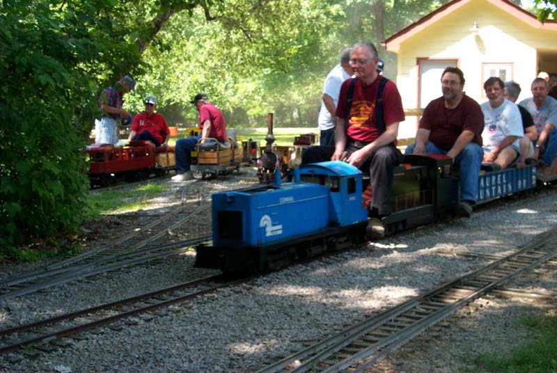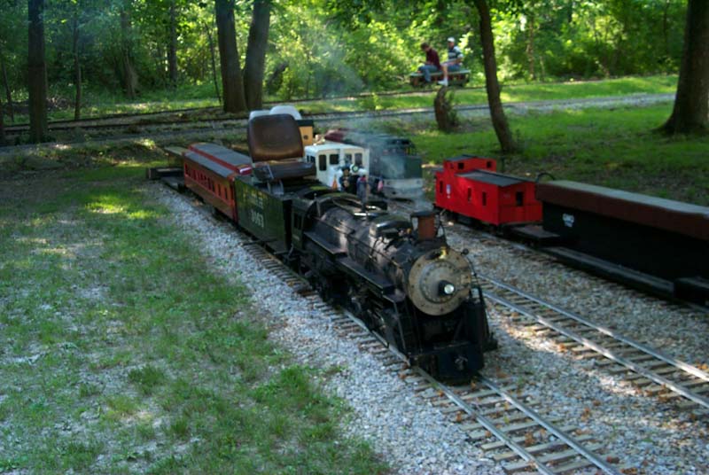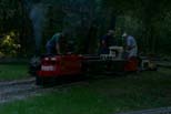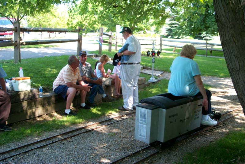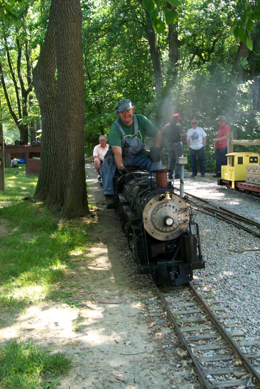Matt Philpott reaching out for the switch stand to clear the block and my red signal. With the fire banked the Hudson and the other engines wait as owners head for the picnic pavilion to chow down.. |