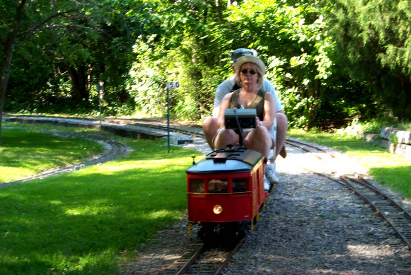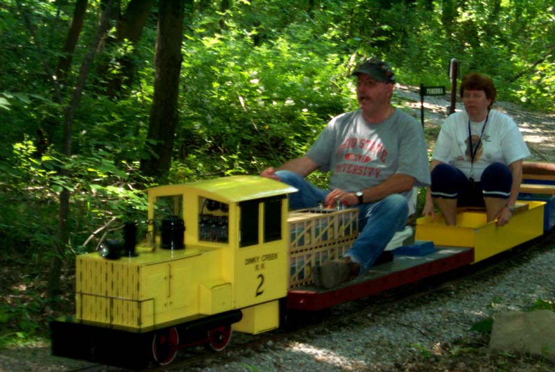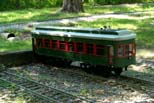 Matt Philpott brought this newly acquired interurban which is electric powered. Bill Bodemer is at the controls of Dick Philpotts Dinky Creek train just past Pandora. |