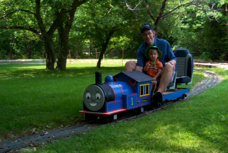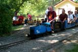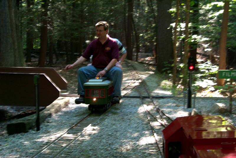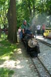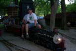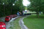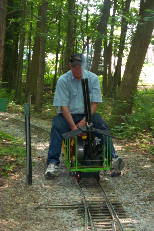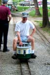 Clayton passes us at Horrendous with the engine that his grampa George is building for him. Marcel Uhrich giving a friend a ride on "Scrappy" behind the station. |