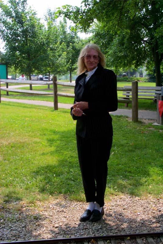 Frank with Diana Mitchell and Ron Rose pass by me at Horrendous. Karen at the controls of Joe's interurban rounding the curve coming into the station. |