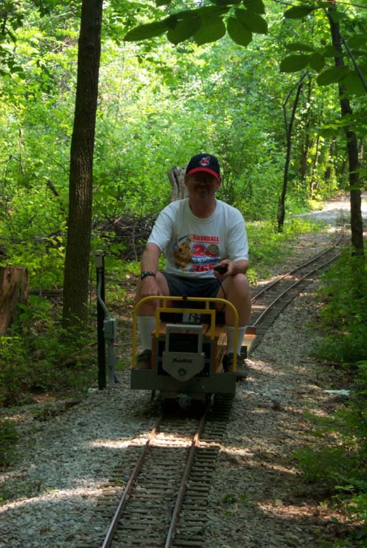 Rex Shriver at the controls of his switcher with the video camera mounted on the hood. Rick Nagy with Dave's speeder on Pandora reverse track. Running this way will bring you back to the station in the opposite direction. |