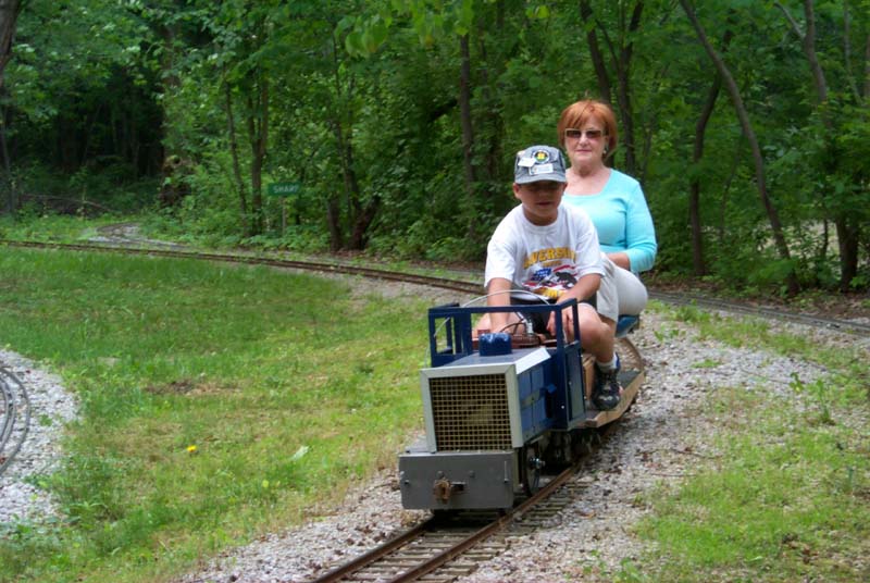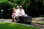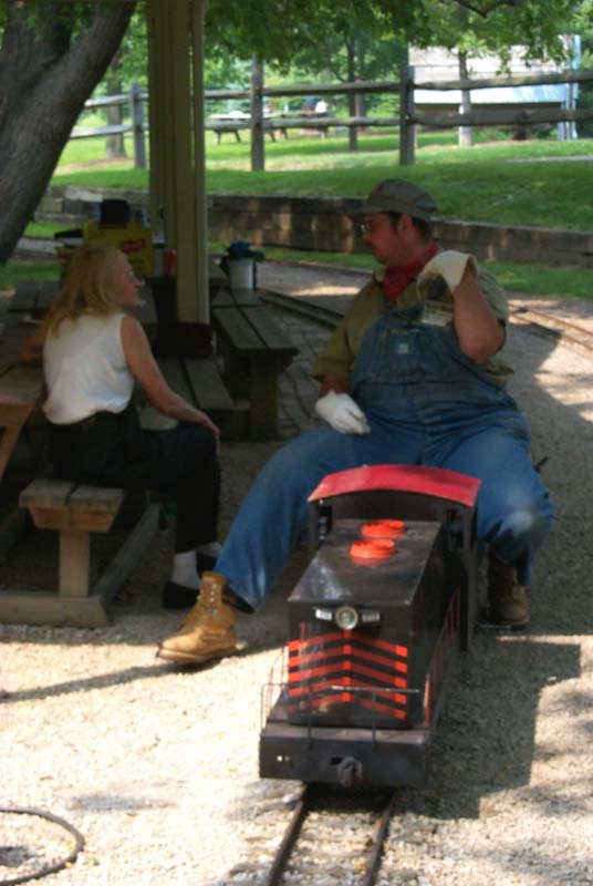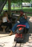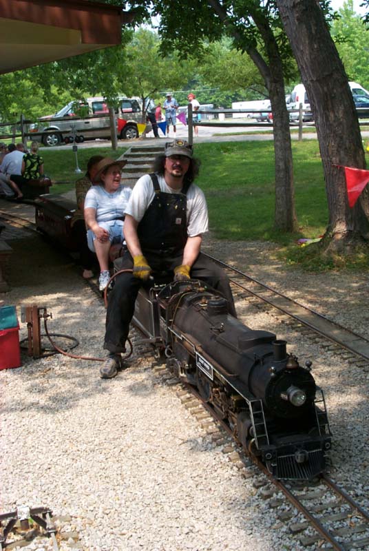 Clayton Davidson coming back to the station after giving his grandmother Marilyn a ride. Mike and Roberta Uhrich with his boxcab engine he built this spring coming in to the station. |