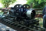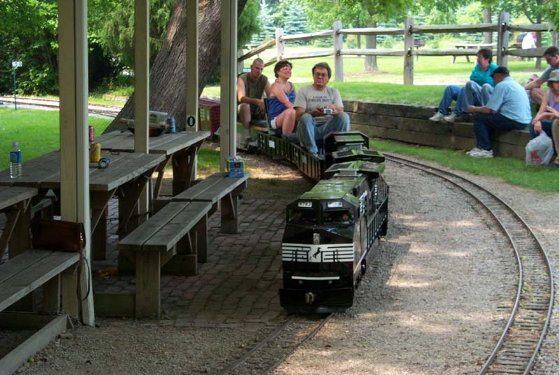 Ron Trenhaile leaving the station with his battery powered F40ph diesel. As we pass Zip Junction we find George Metts with his Maytag Hit n Miss waiting on Short line for traffic to clear. |