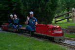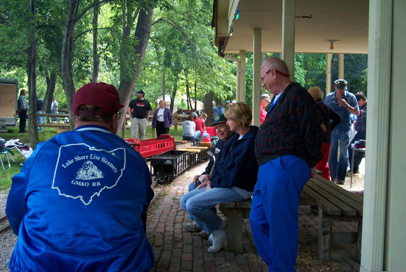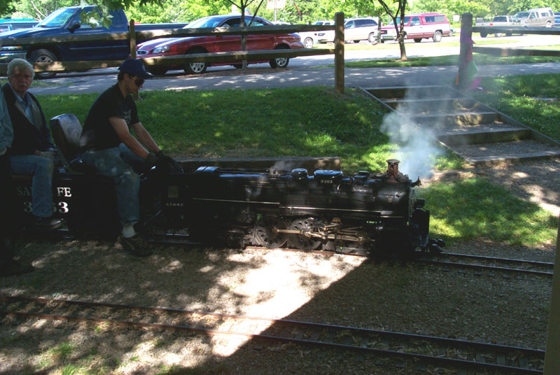 Bob Beardslee pulls into the station with Ken Vendlinger on the rider car. Waiting for the congestion at the station for the trains to pull out |