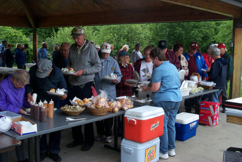 Robbi's brother Dave and Mike Elbert cooking the steaks. Kitty at end of table checking list and Robbi serving the steaks and baked potatoes to the group in line |