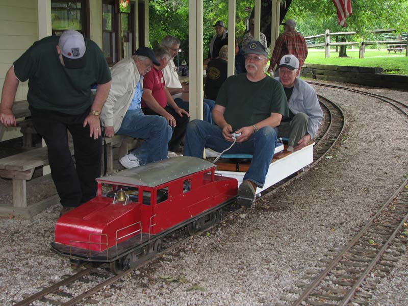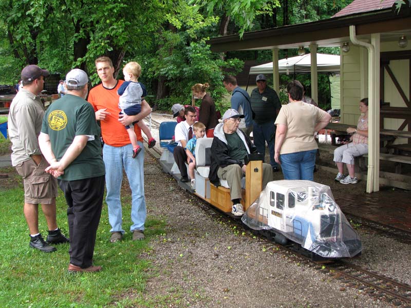 Dave heading out for another run with his grandaughter Claire, Erin and Jeff Foster behind him. Alex Bruchac motoring Joe Laskowski's interurban the station. |