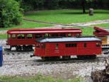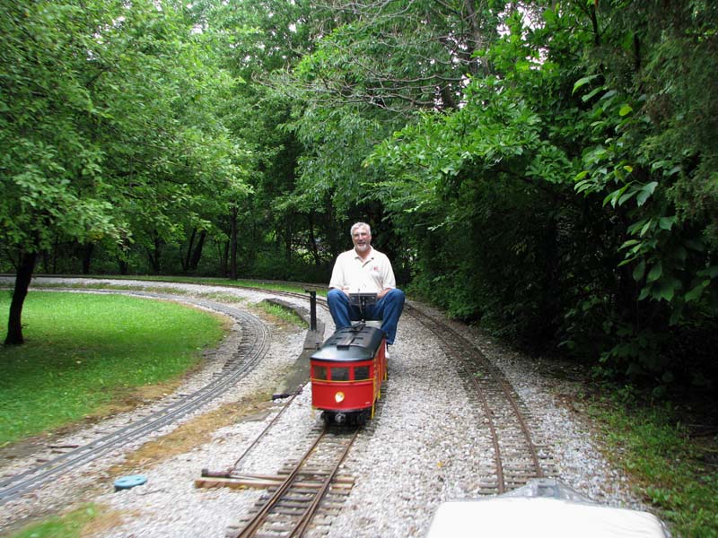 A proud Grampa, Dave Foster with his grandaughter Claire by the steaming bays. Joe Laskowski at the controls of his interurban heads out for a ride in the woods. |