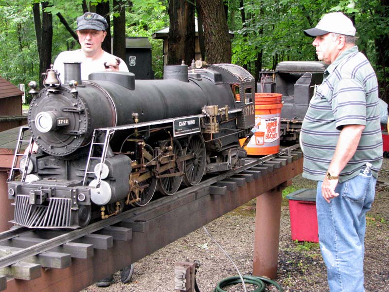 Frank explaining the East Wind to a guest as he prepares his engine for the run. Marcel tending to his Consolidation as the Hudson with a full head of steam lifts it's safety. |