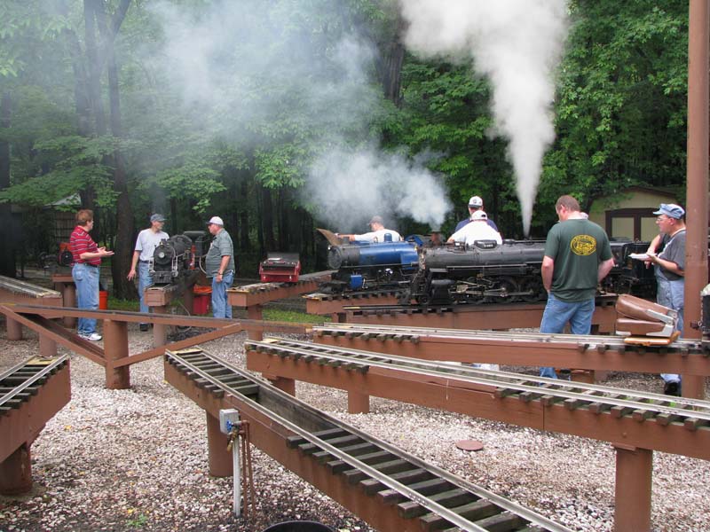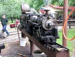 Sean Roberts readies his switcher as he raises steam in the boiler. Dave Harnish's steamer sits on one of the steaming bays. |