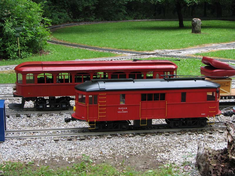 Ken and Lew pass through the station on their way for another run down the mainline. Frank Russell's interurban and Joe Laskowski's sit in the sidings near the station. |