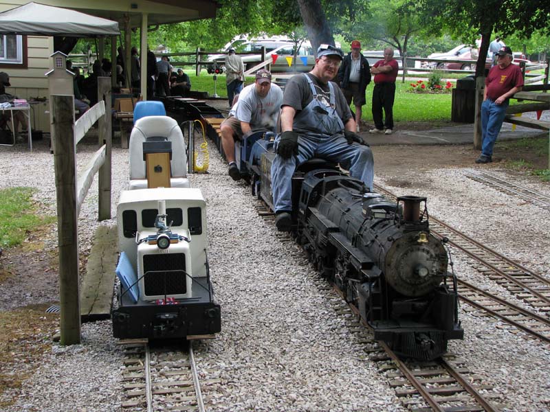Ken Brooks re-motored the electric cab that was built by George Davidson, gets a longer run time now, is leaving the station with Ron Trenhaile. The activity on the tracks West of the staton. |