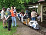 Dave Foster, leaving the station, is taking his wife Sandi and guests for a ride on his speeders. Rex pulled into the station for another load of passengers and you can tell by the cover on his engine we had rain this morning. |