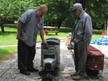 George Metts brought his Maytag Hit-n-Miss engine which is always fun to operate. Karl has backed the Hudson up to Marcel's Consolidation to run double-headed with a load of passengers. |