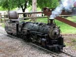 Marcel Uhrich brought his newest addition, a Consolidation engine, to the track for a steam-up and run. Karl Losely stands behind the Hudson on one of the steaming bays as Ken Brooks passes in the background. |