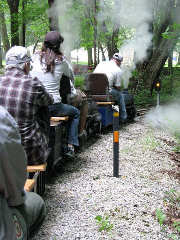 A view over the shoulder of Ethan running the Snoopy train and the track ahead. Rick Nagy eastbound out of the station with a load of passengers as they approach Sharp. |