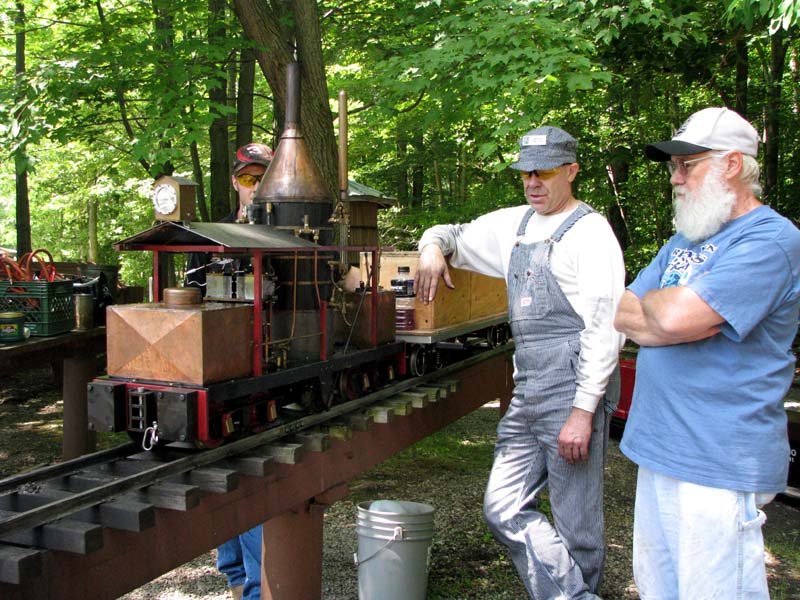 Dave Harnish pondering a problem with the engine that happened during the transportation to the Meet and that's Skip Frank's Columbia in front. A view that relates to power as the two engines wait to be steamed up today. |