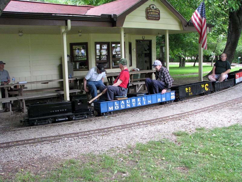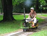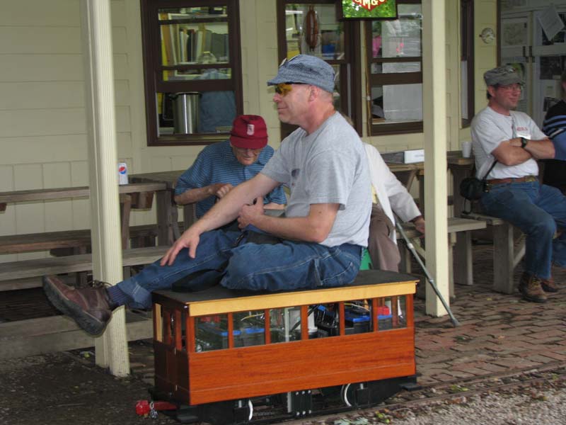 Dick Schmidt running Don Speidel's train as he passes through the station. With Don in the engineers seat he tries to coax riders at the station to climb aboard a car. |
