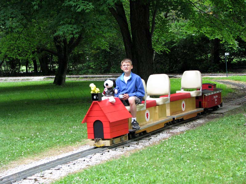 Austin running the Snoopy train on the Orchard Loop behind the station. Ethan waiting for his turn to run the train as he stands by Amy his Mom. |