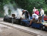 Sean coasting into the station with his 0-6-0 switcher which is a smooth running engine. Ken holds his nose as he waits for a signal and the double-header passes on an adjacent track at Horrendous. Wonder why? |