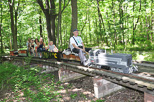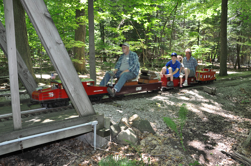 Scott gives a wave as he passes over Bridge No. 6 at the bottom of the hill on his way towards Fern. Ken is about to pass through the Truss Bridge with his passengers on his way towards Mackey's Run. |