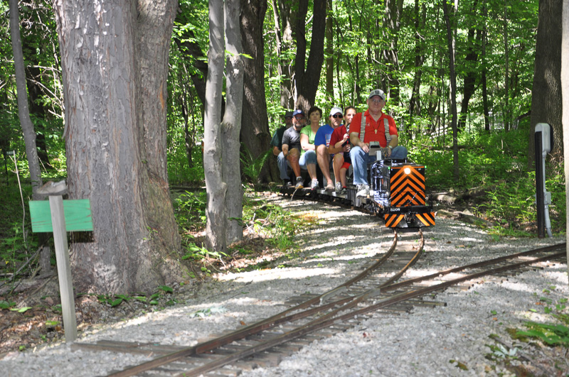 Ted Nyland is gaining speed with his pair of interurban's after having just left the station with his passengers. Ken Vendlinger gives a wave along with his passengers as they rumble over the grade crossing for the Park Access Road on the mainline. |