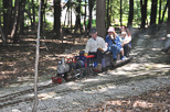 John on his next trip around is at the midpoint of the Big Bend Bridge with his riders as the train rumbles over the wooden deck. Now there is a happy load of passengers on Chet's train as he blows the whistle for the photographer. |