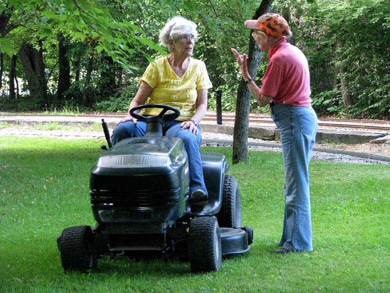 Ron Trenhaile, Dick Clark, Rick Nagy and Edith who apparently we didn't work hard enough today as she still has some energy left. Pam Znidar walking the mower for it's exercise as she mows the grass at the unloading parking area. |