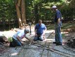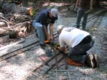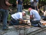 Wally and Rick Nagy are re-installing the repaired crossing by sliding the rail joiners back into position. Frank and Wally screwing the rail back on the ties. |