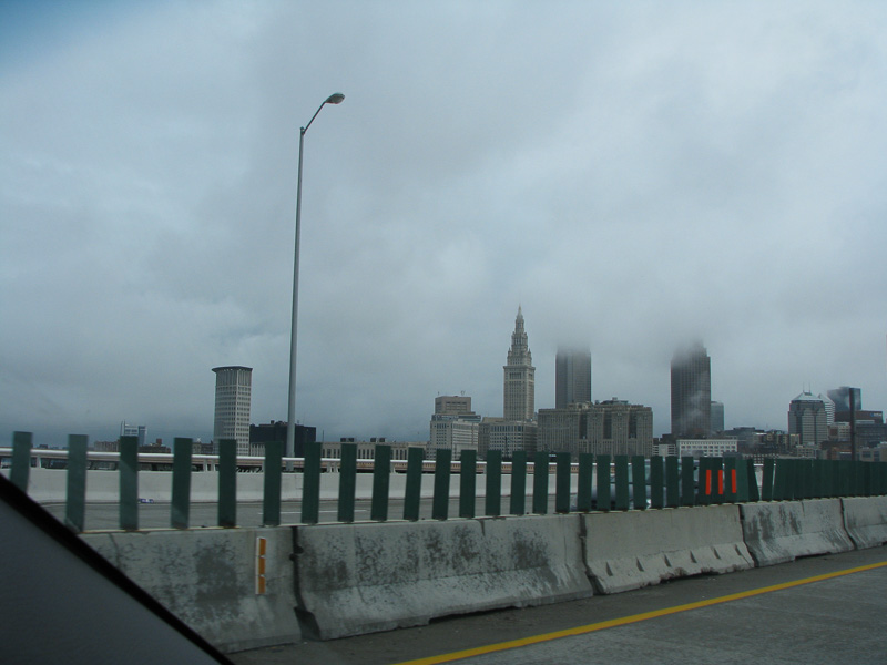 Since I live 60 miles west of the track the sun was shining when I left home but a light rain started as I crossed the bridge on my way through downtown Cleveland. Downtown Cleveland was being socked in by the low clouds and the light rain. |
