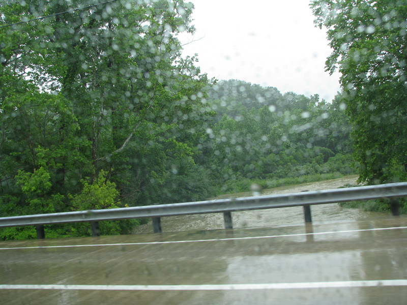 This is what greeted me when I was approximately 1 1/2 miles west of Route 306, my turn off, which was a torrential downpour. The creek at the bottom of the hill going to Penitentiary Glen generally has a light rapids with many rock showing but the depth of the water running through clearly hid them today. |