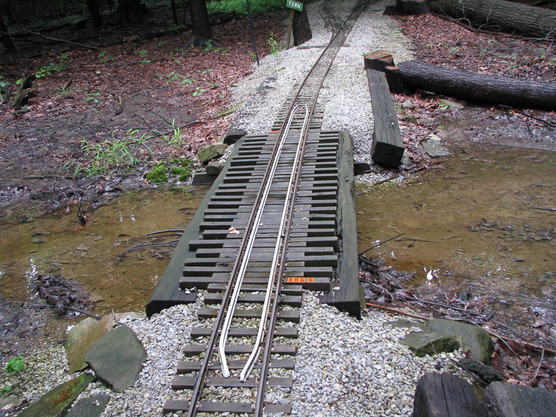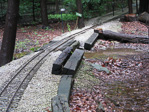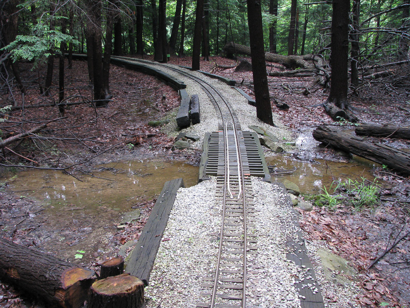 A view from the other side of the bridge and the railroad ties for the walkway will be placed on the left side as viewed. This tree with its unusual root stands where one large tree was felled by the Park Service across the track from Fern. |