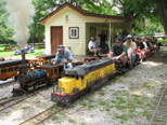 The young man waits patiently with his Mom for the ride to begin and that's Don Speidel behind them as conductor. John departs the loading area and passes in front of the steaming bay area before taking the switch which will guide the train to the mainline. |