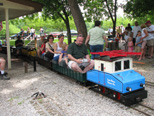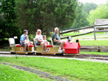 Mike Harklroad gets his train rolling with his passengers as he starts his next run. Ken Vendlinger, always has a smile for the camerman, as he leaves the station with his charge of passengers. |