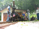 Thomas Ridler as engineer with his Dads' electric box cab takes a run out on the main line before the public run. Skip Frank with his steamer "Lynn" waits to load as soon as Mike Harkleroad departs the station with his passengers. |