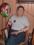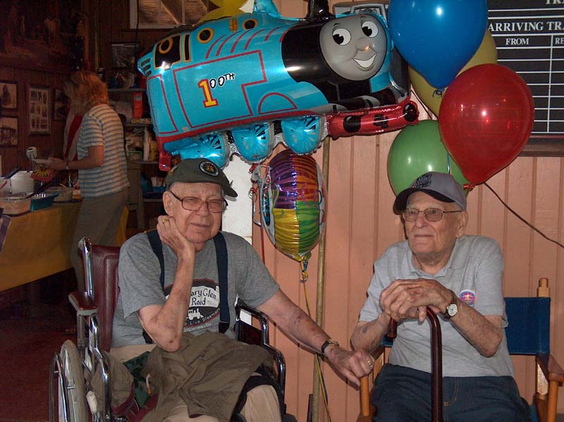 Clyde Bleil, our birthday boy, at 100 years old enjoying the festivities. Clyde and his friend Marie pose for the camera during his birthday party at his home track where trains were running. |