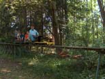 One of the guests at the throttle of the shay as he heads back to the station. Another guest at the controls of the diesel engine coming out of the woods toward the station. |