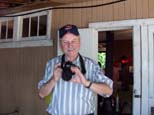 Rex standing at the station waiting for his train to come in. Something about a nod of the head, a pull of the ear and.... Paul Emch brought his engine and is showing Dick the controls as Rick waits for the ride to begin. |